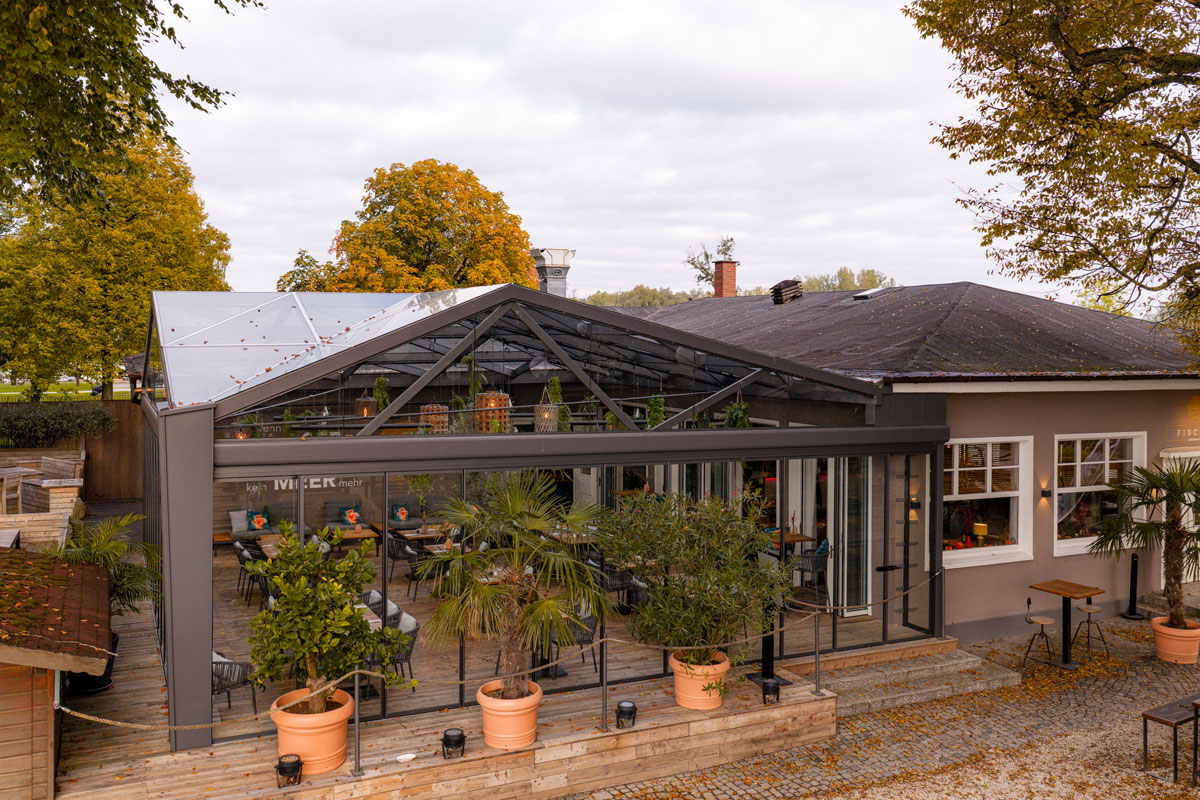Unsere Winterlounge wird zur offenen Sommerlounge. Sonne drin, Regen draußen – ganz entspannt unter Glas.